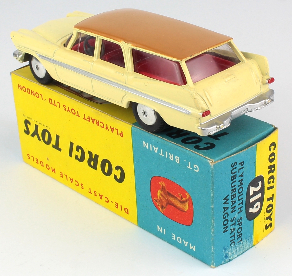 Corgi 219 Plymouth Sports Suburban Station Wagon. Cream & MATTE TAN issue. Grey base. Very near mint/boxed. From The Reference Collection.