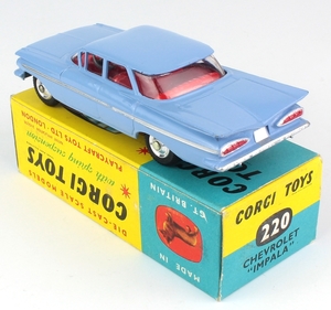 Corgi 220 Chevrolet Impala. Very near mint/boxed. Powder blue issue with red interior, SHAPED SPUN wheels from The Reference Collection.