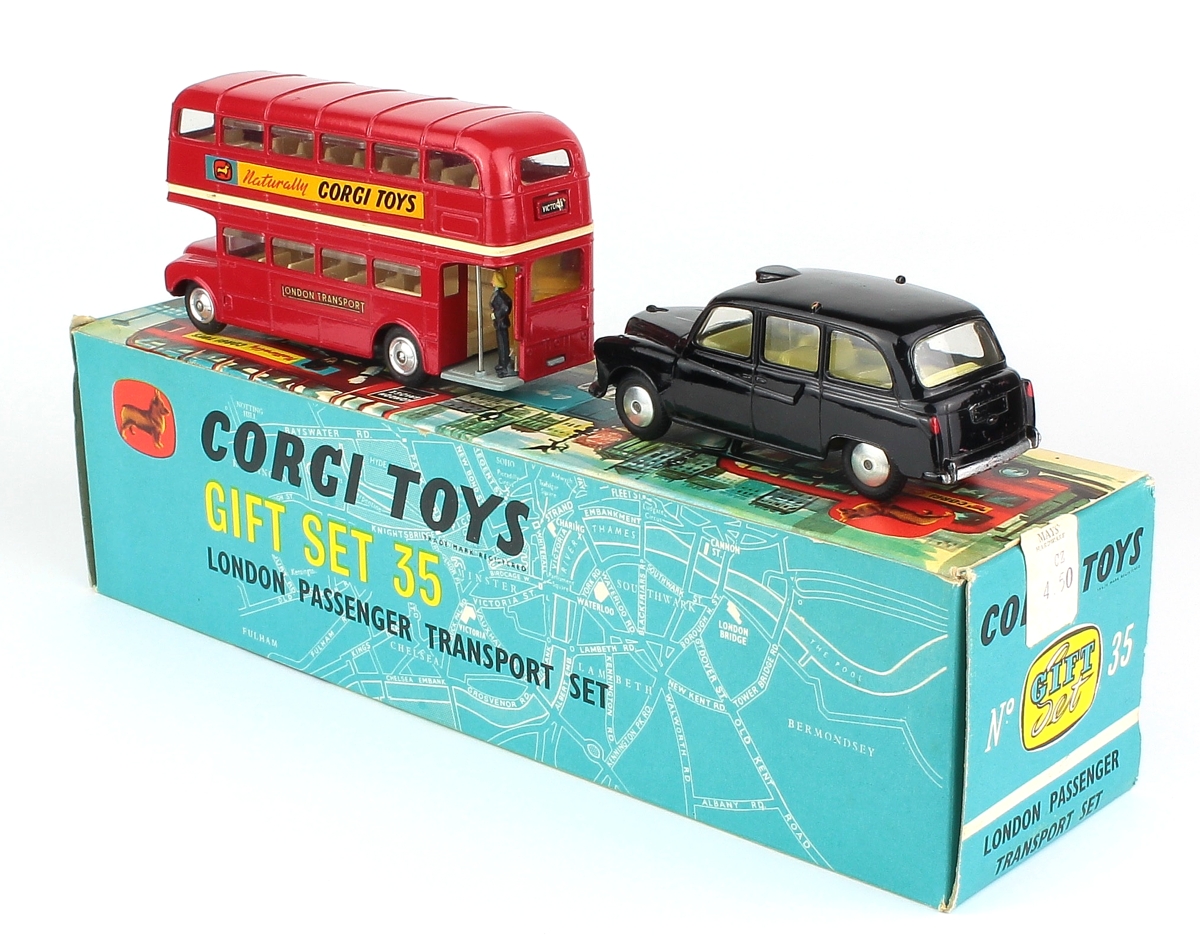 Corgi Gift Set 35 London Passenger Transport Set. Excellent plus-near mint (contact marking)/boxed with packing card. Scarce set. From The Lake District Corgi Collection.