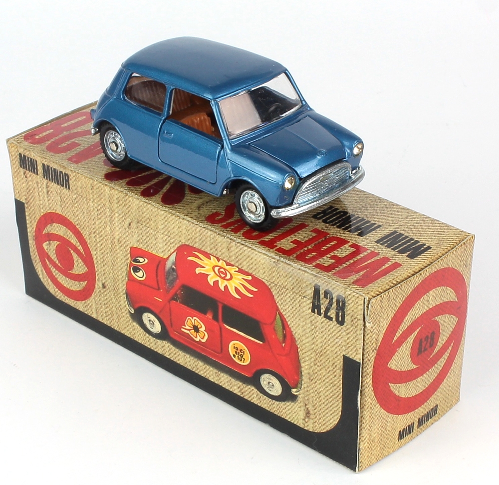 Mebetoys A 28 Mini Minor. Metallic blue issue with sheet of unapplied 'Flower Power' decals. Very near mint/boxed. Scarce item.