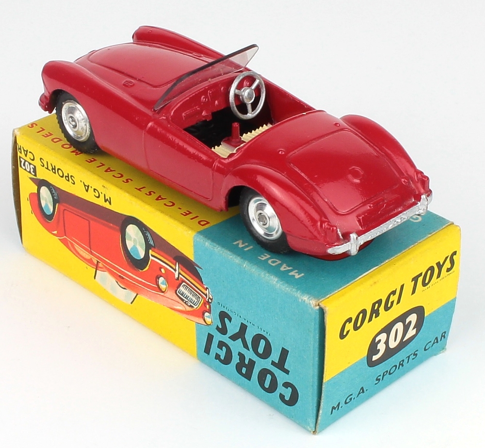 Corgi 302 MGA Sports Car. Very, very near mint/boxed. Deeper red issue with shaped spun wheels. From The Reference Collection.
