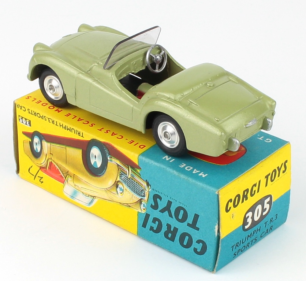 Corgi 305 Triumph TR3 Sports Car. Very, very near mint/boxed. Metallic olive green version with shaped spun wheels. From The Reference Collection.