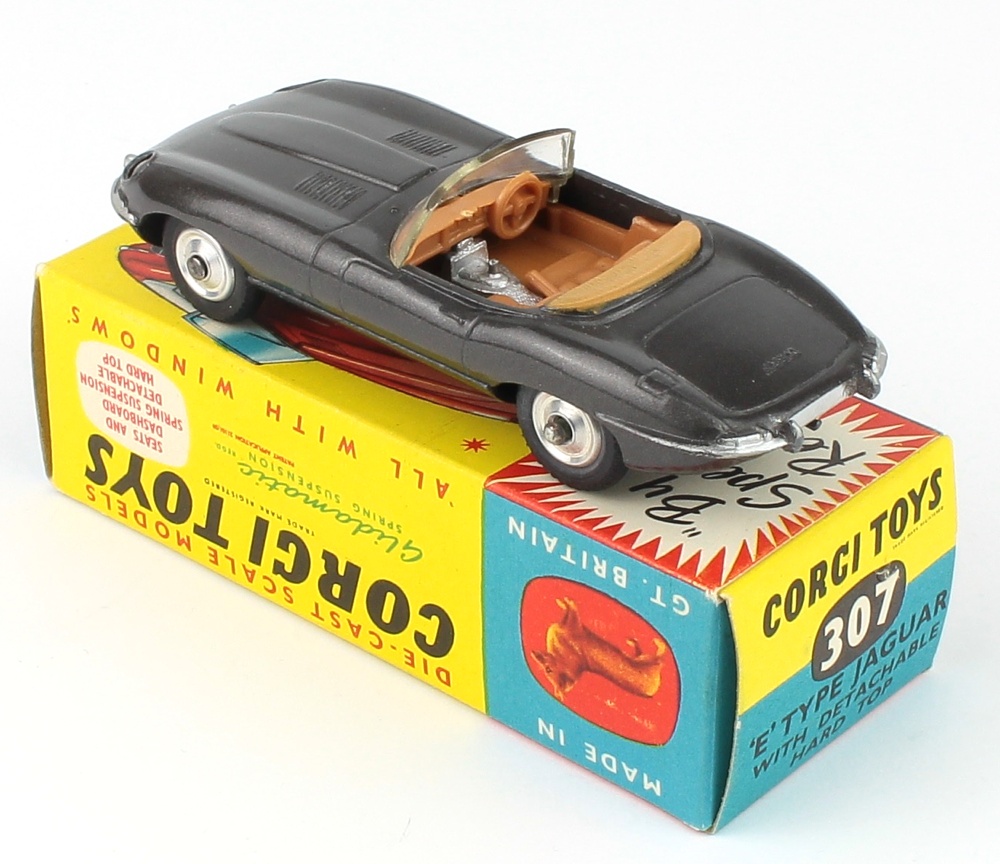 Corgi 307 'E' Type Jaguar with detachable hard top. Gunmetal grey & red. Very, very near mint/boxed.