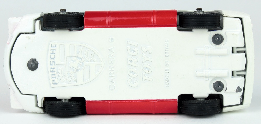 Issued during 1967-69, this racing Porsche has a bright white finish with deep red bonnet and doors. Harder to find with Racing Number 1 labels. Purplish-blue engine cover.