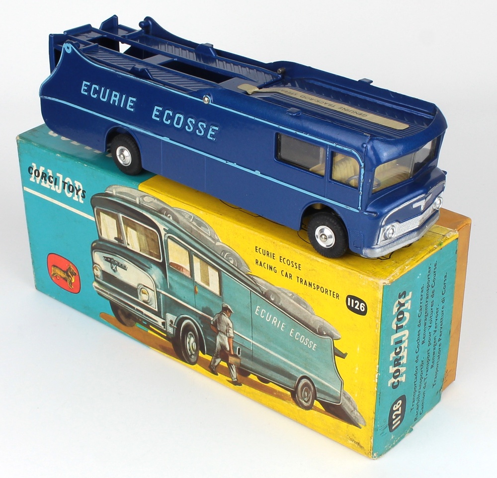 Corgi 1126 Ecurie Ecosse Racing Car Transporter. Near mint plus/boxed. Later version with RAISED BLUE LETTERING. With card packing & leaflet. From The Lake District Corgi Collection.
