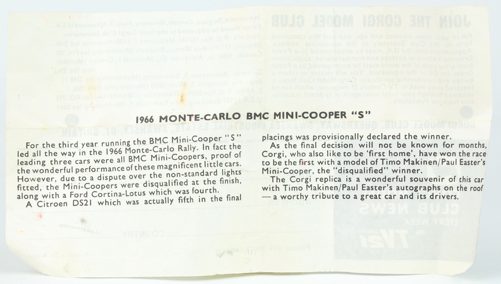 Corgi 321 Mini Cooper 'S' Monte Carlo 1966 with roof signatures, racing number 2. Very, very near mint/in 321 box with 1966 flash label. With Leaflet. Scarce. From The Cheshire Collection. Bids are invited on this item - please see the relevant section on our Faq Page. QDT starting bid £300. Please note that QDT apply 12.5% buyer's commission.