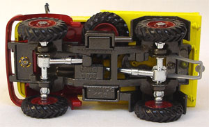 With one owner from new, this truck has a fresh bright red and yellow finish, red interior. Intact wing mirrors with reflective pieces still in place, and a plastic, olive green, detachable canopy, grey plastic tow hook. A few small chips only on the edge of the truck back.