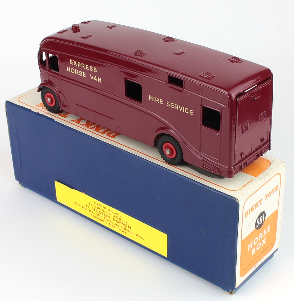 Dinky 581 Horse Box. U.S. export issue. RED WHEELS. Scarce. Very near mint/boxed. Version with 1 long paper label. Correct with English only print. From The Nelson Collection.