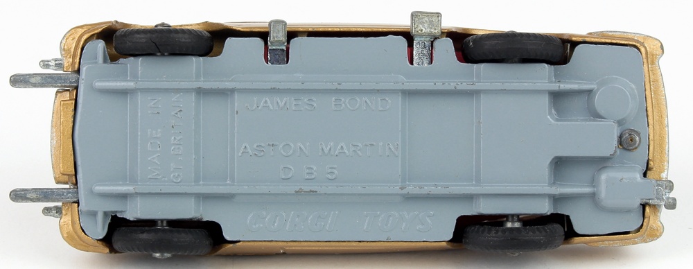 This 1st James Bond Aston Martin is in all original condition with none of the reproduction accessories, rife with this issue. Note the indicator light casting and double side vent present on this early issue. The car is fully functioning, complete with both figures. Suspension is present on wire wheels. Original tyres are supple and well-shaped. This Aston Martin DB5 model has a lustrous intense, deep toffee-gold finish – an especially attractive example, since often the Aston comes in a variety of shades. Note the light tan ejector roof interior too, with a bright red interior. A rare version. Thankfully, this model does not have the near-obligatory centre mark on the roof. So nice to see like this! Gives the impression of unsold old shop stock.