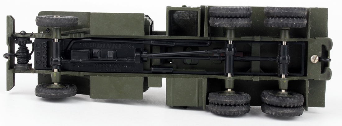 French Dinky 823 Military G.M.C. Truck. Near mint/boxed. Scarce. With card packing plinth, sealed packet of accessories and promotional leaflet. From the personal collection of a professional TV & Film Set Designer.