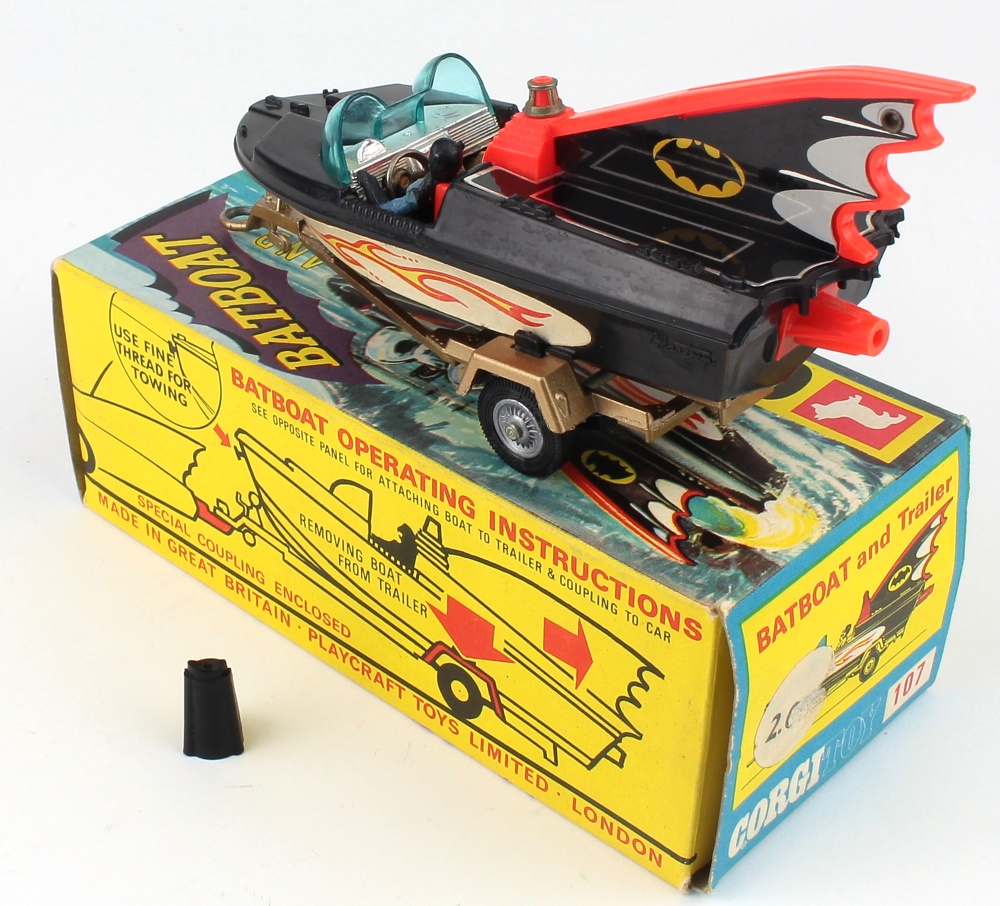 Corgi 107 Batboat. Early 'tin fin' issue. Blue screens. Very near mint (marking to trailer tow ring)/boxed. Complete with coupling attachment. From The Berlin Collection.
