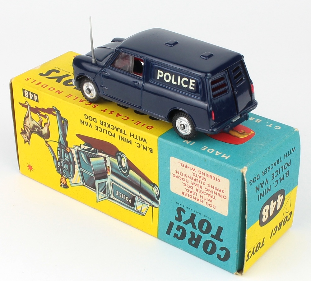 Corgi 448 B.M.C. Mini Police Van with Tracker Dog. DEEPEST BLUE & SPUN WHEELS issue. Near mint plus/boxed. Pristine card plinth with colourful backdrop. From the personal collection of a professional TV & Film Set Designer.
