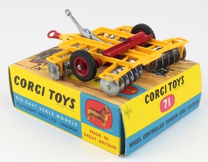 Issued between 1967-72, this agricultural model complements the other Corgi farming models and could be used in conjunction with Corgi 66 Massey Ferguson or Corgi 67 Ford 5000 Super Major Tractor. It has a bright red, yellow and silver finish with a lever to raise or lower the wheels (works perfectly). Red plastic tow bar, red metal hubs.