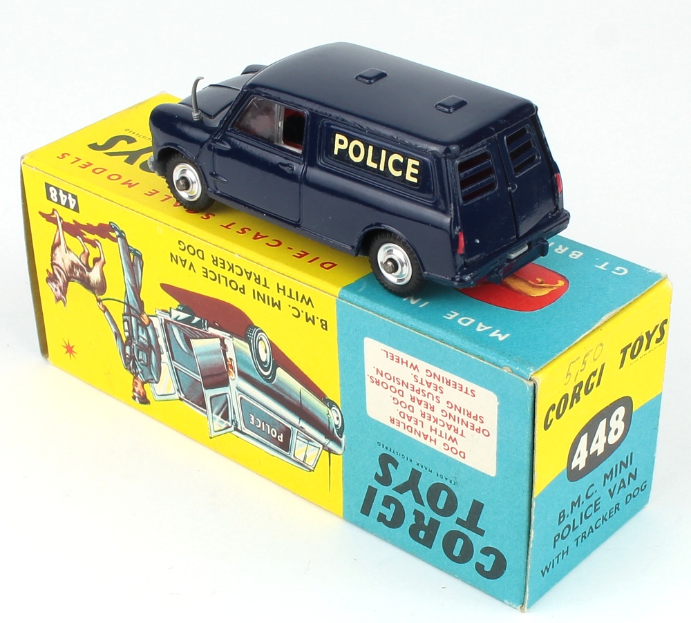 Corgi 448 B.M.C. Mini Police Van with Tracker Dog. SPUN WHEELS issue. Near mint plus/ boxed. Nice box! From the 'Exclusively Mini' Collection.