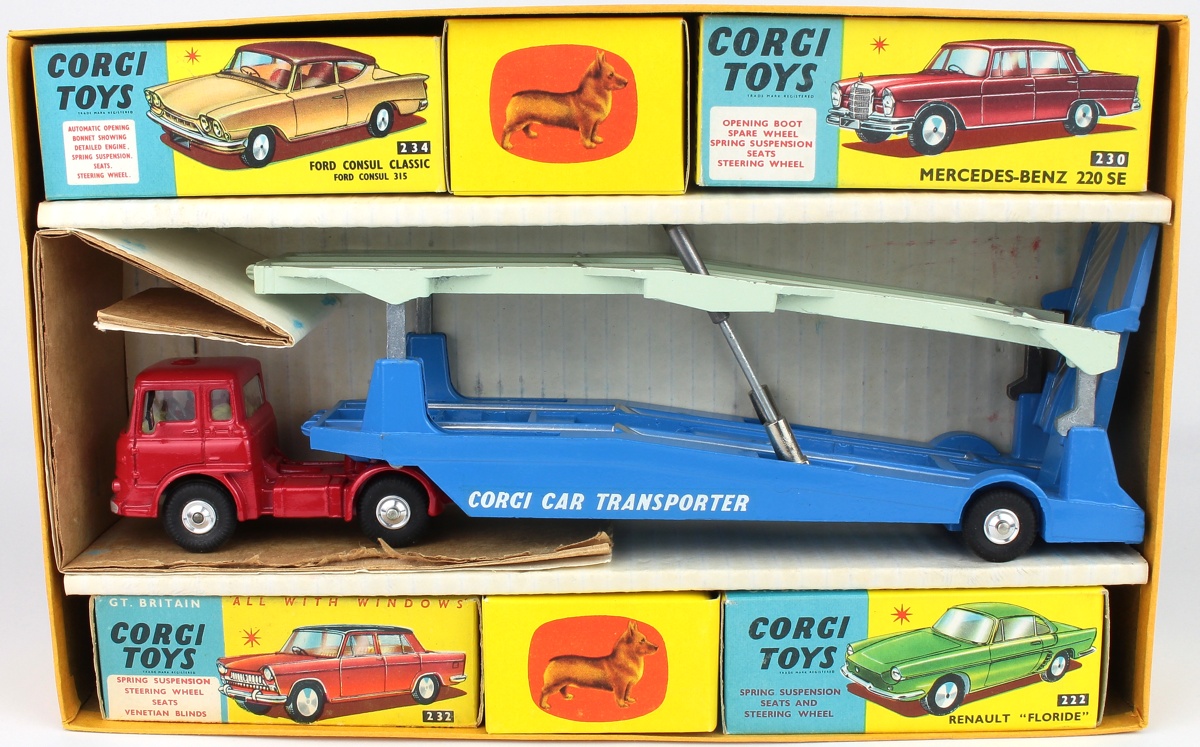 Corgi Gift Set 28 Carrimore Car Transporter & 4 Cars. Very near mint/boxed. Scarce set with card insert, leaflet and 2 Dummy Boxes.