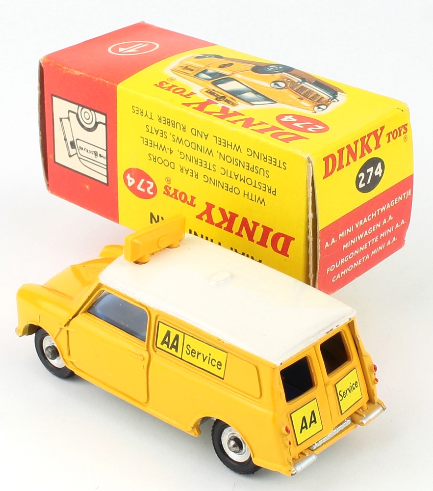 Dinky 274 A.A. Mini Van. Scarce issue in yellow with a WHITE roof and BLUE interior, bare metal base. Late issue. A.A. lettering & 'SERVICE' with yellow background on the rear doors. Very near mint/boxed. From The Cologne Collection.