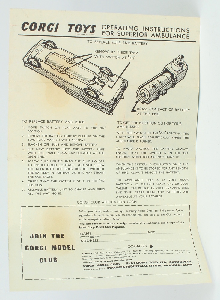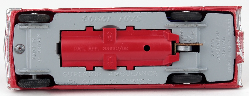 Corgi 437 Superior Ambulance on Cadillac Chassis. Red and deeper cream version with red roof light & clear indicators. Near mint plus/boxed, with Instruction Leaflet. Bright box. From The Reference Collection.
