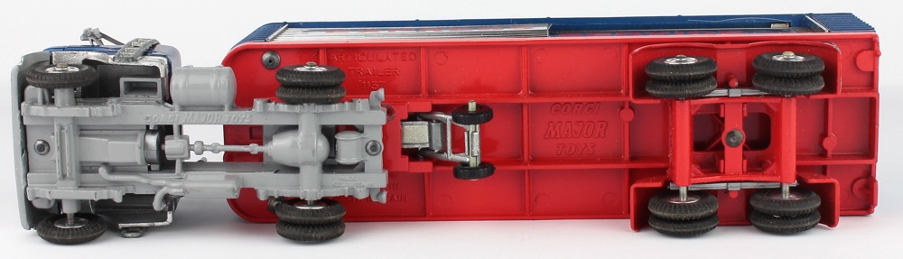 Issued between 1966-69, this Ford articulated truck is in very close to mint condition. This truck just gleams! Complete “EXPRESS SERVICE” detailing on both sides of the bright silver, untarnished sliding doors, both wing mirrors and shiny spun wheels. So eye-catching and it comes complete with the original mechanic figure, too.