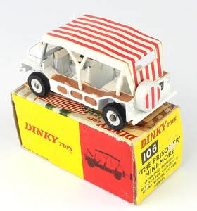 Dinky 106 'The Prisoner' Mini-Moke. Scarce version with CHROME windscreen frame & light brown running boards & side details. Very near mint (small lower section of wheel cover missing)/boxed, with clear plastic packing strip. From the personal collection of a professional TV & Film Set Designer.