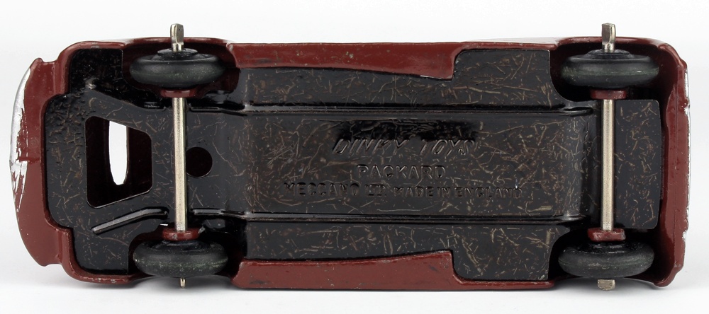 Issued between 1947-50, this Packard model has a shining rich brown paint finish, black ridged wheels and bright baseplate (minor spidering). This model would have been sold out of a Dinky Trade Box, so never boxed individually.