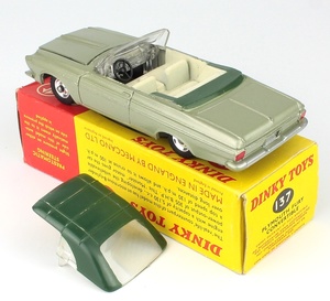 Dinky 137 Plymouth Fury Convertible. Greenish-silver finish with DEEP GREEN hard top. Very near mint /boxed. Scarce. From The Reference Collection.