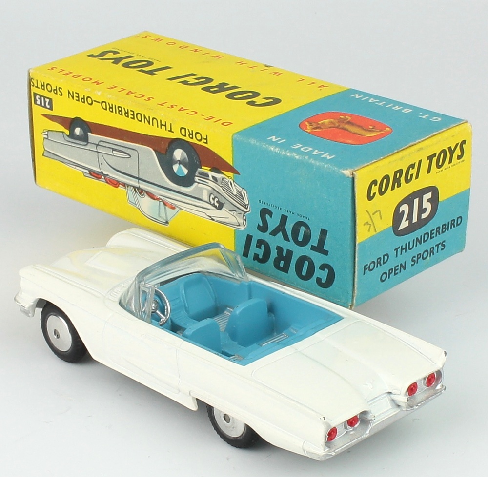 Corgi 215 Ford Thunderbird Open Sports. White version WITHOUT 1959 licence plate. Flat spun wheels. Very near mint/boxed. From The Fenman Collection.