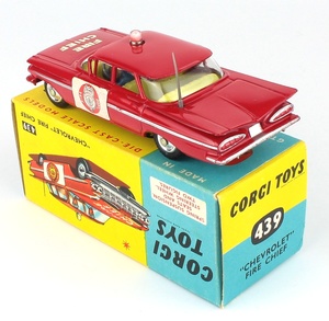 Corgi 439 Chevrolet Impala 'Fire Chief'. With RECTANGULAR paper labels. Very near mint/boxed, with card packing. From The Reference Collection.