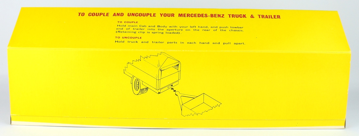 The large card outer box with factory applied ‘FIRST WITH OPENING CAB DOORS’ label is clean and bright. A little handling tear to the tuck-in part of both large end flaps and a fleck of surface loss and the remains of a price label. Packing foam included!