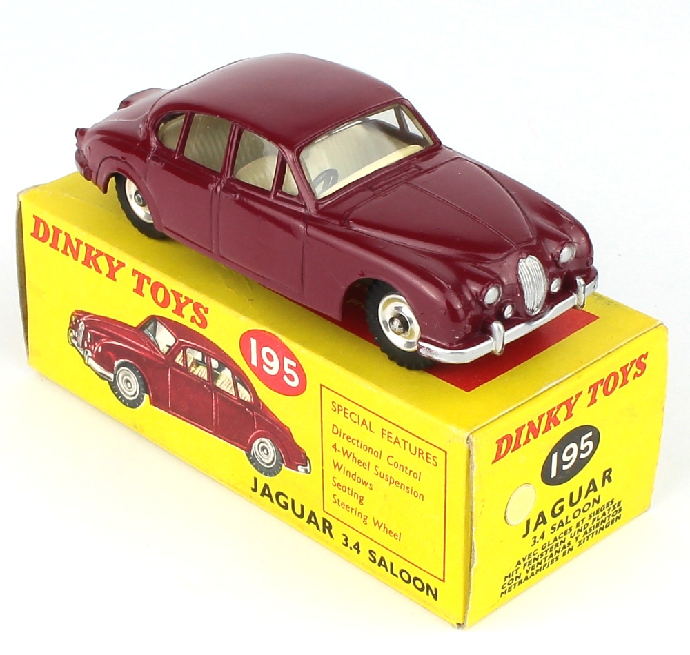 Dinky 195 Jaguar 3.4 Saloon. Very near mint/boxed. Maroon issue, cream interior. Nice box!
