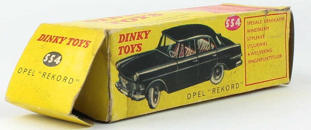 South African versions of French Dinky are even harder to find and this French Dinky Opel is in all original, near mint condition in a complete Afrikaans box! Vibrant mid-blue finish and a fine silver trim, light grey detailed interior and spun wheels (some age tarnishing). Smooth white tyres have a little age wear and two have a flat spot. Base (tarnishing spots) has ‘Dinky Toys 554 Opel Rekord Made in France’.