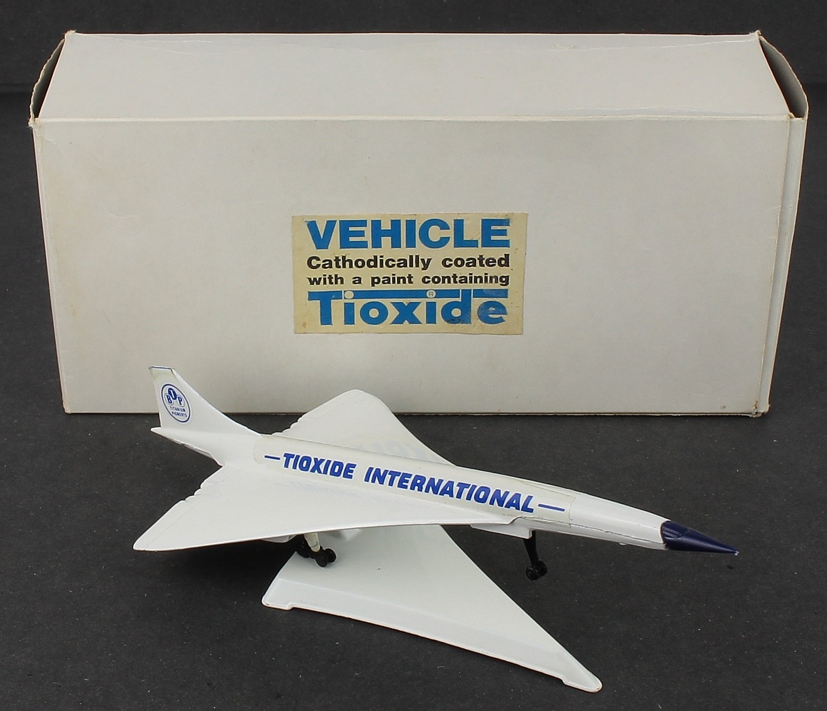 Rare Promotional 'TIOXIDE' version of Corgi 650 Concorde with Stand. Very near mint/boxed (in correct plain white card box with 'TIOXIDE' Label). An exceptional model from The Pennsylvanian Collection. A First for QDT! QDT starting bid £300. Please note that QDT apply 12.5% buyer's commission.