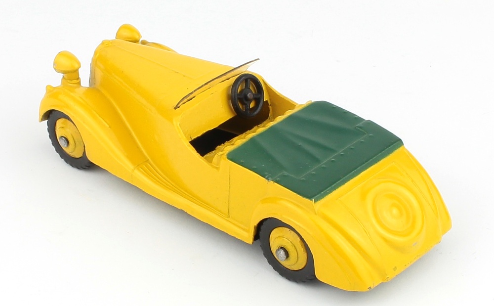A scarce issue, this model has a vibrant yellow finish with a dark green tonneau and yellow ridged wheels, intact original windscreen, bright baseplate. Well-shaped original tyres.