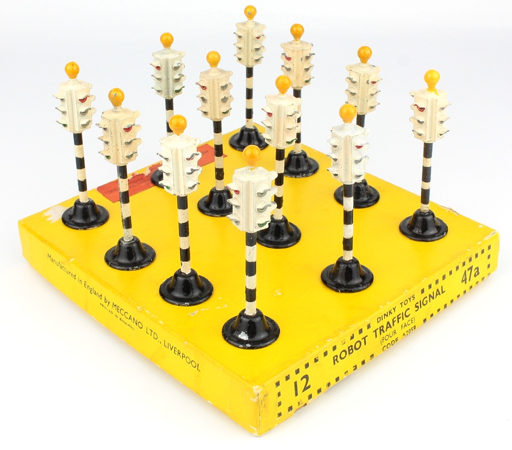 Trade Box of 12 x Dinky 47A Robot (Four Face ) Traffic Lights. PRE-WAR issue. With EXPORT LABEL 'MECCANO COMPANY OF AMERICA INC.'. Near mint/boxed, with original card dividers. Scarce accessory items from The Phillips Collection.