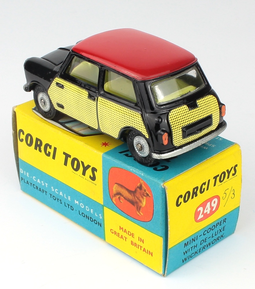 Corgi 249 Morris Mini-Cooper 'Wickerwork'. Very, very near mint /boxed. Cast wheel issue WITH horizontal casting line. From The Barcelona Collection.