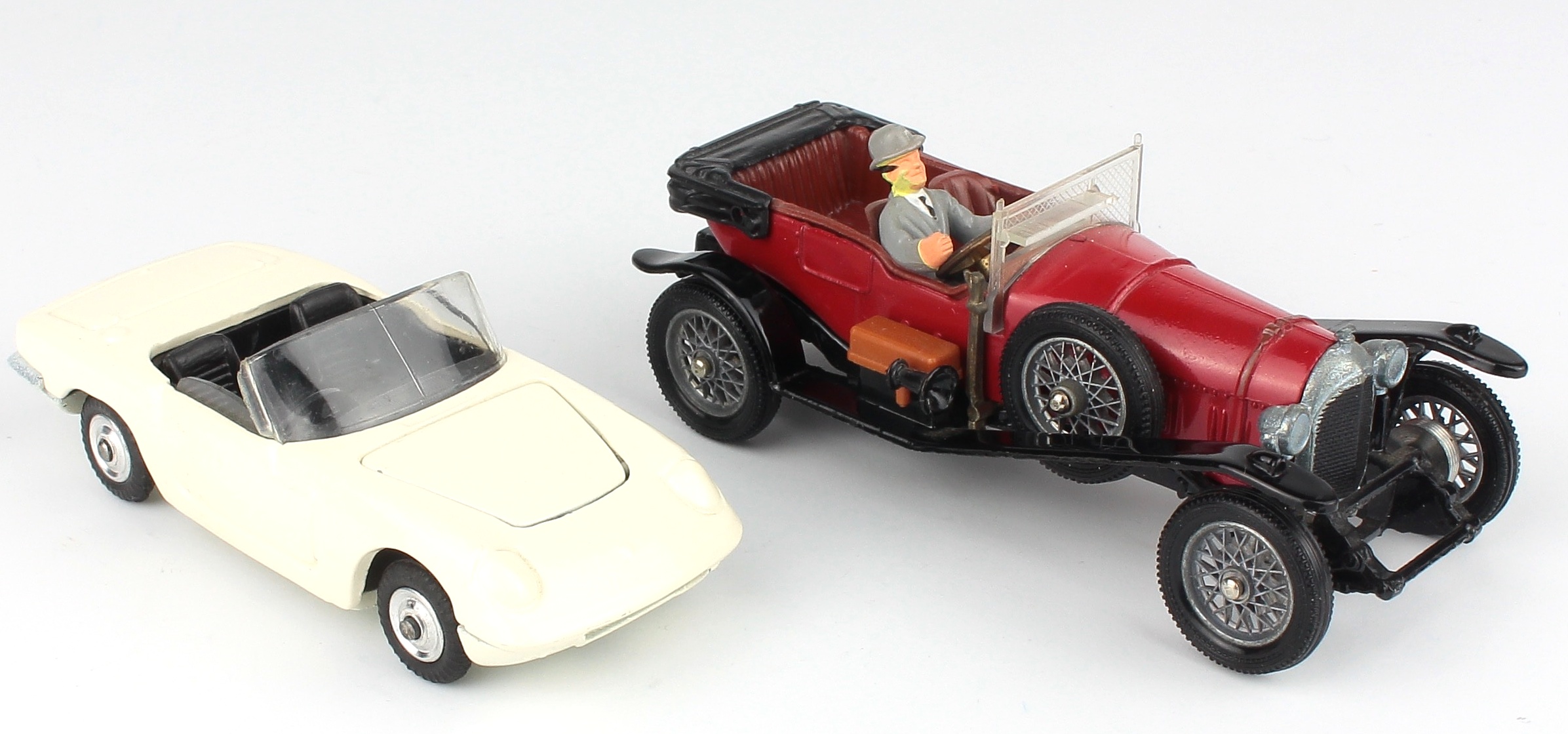 1) John Steed’s Bentley in red and black finish, complete with all parts, and including the figure of John Steed at the wheel. Virtually mint condition (one small mark to one of the running boards). Silver spoked wheels. Fine original tyres.