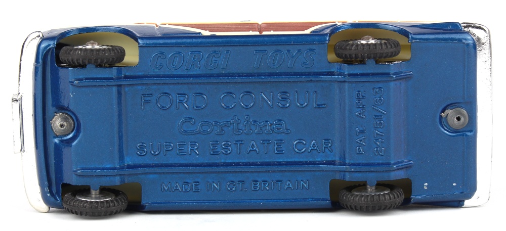 1) Corgi 491 Ford Consul Super Estate Car with “wood” side panels, suspension on bright shaped spun wheels, jewelled headlights, cream interior and opening tailgate. Bright chrome. Fine, well-shaped tyres.
