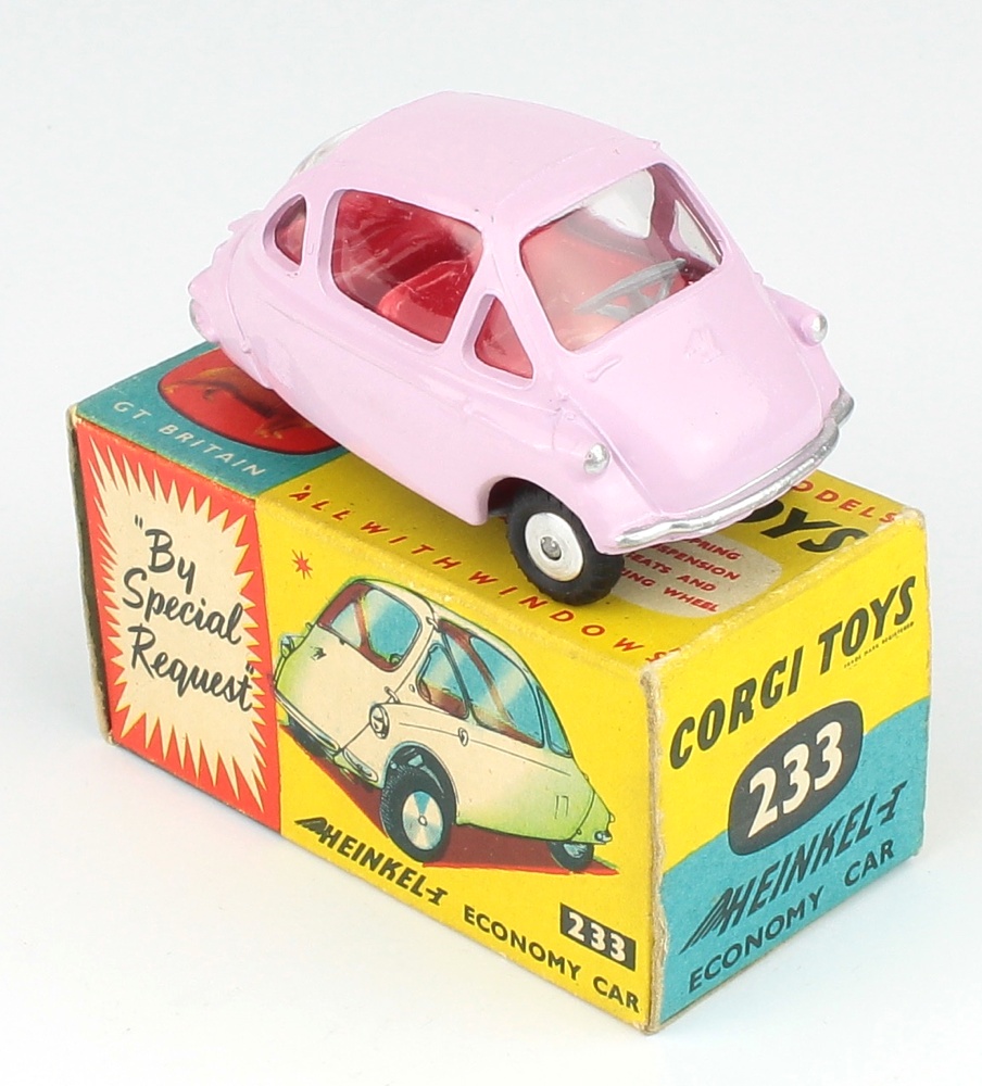 Corgi 233 Heinkel Economy Car. Scarce in lilac-pink. Very, very near mint/boxed. From The Fenman Collection.