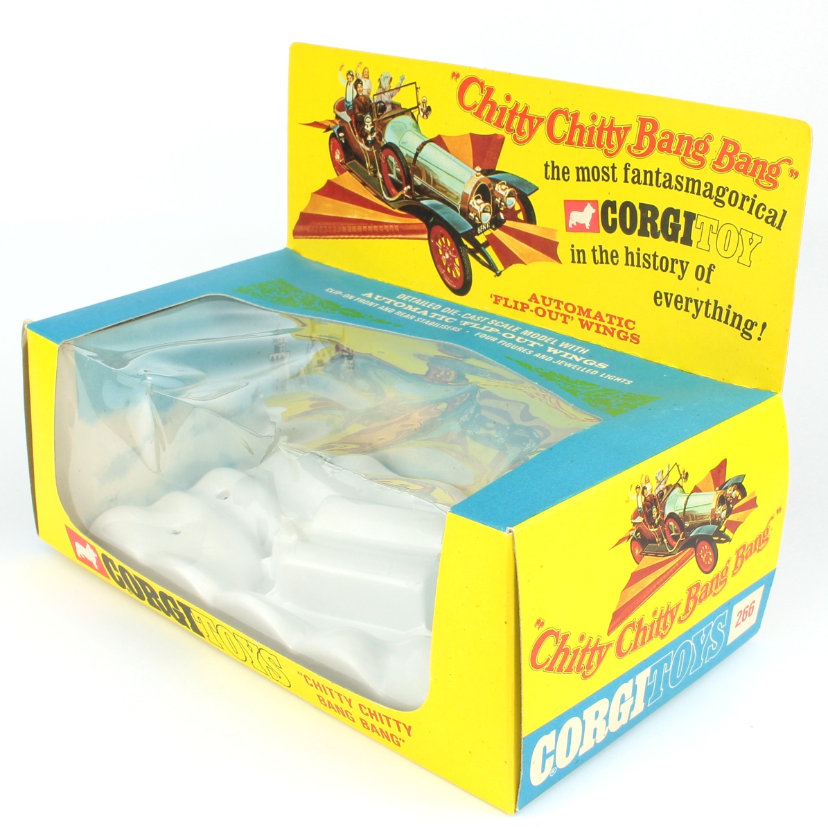 Corgi 266 Chitty Chitty Bang Bang. Very near mint/boxed. GOLD windscreen & larger box version. Complete with all four original figures and wrap-around cloud scene! Original and best 1st issue from The QDT Vault.