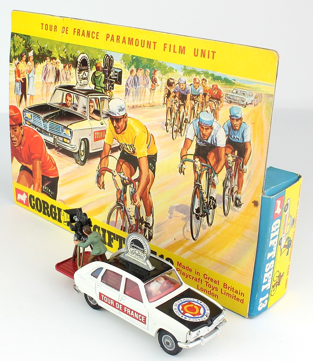 Corgi Gift Set 13 Renault R16 Tour De France Paramount Film Unit. Very near mint/boxed, with GOLD Tripod. Later issue with plain orange card back drop. From The QDT Vault.