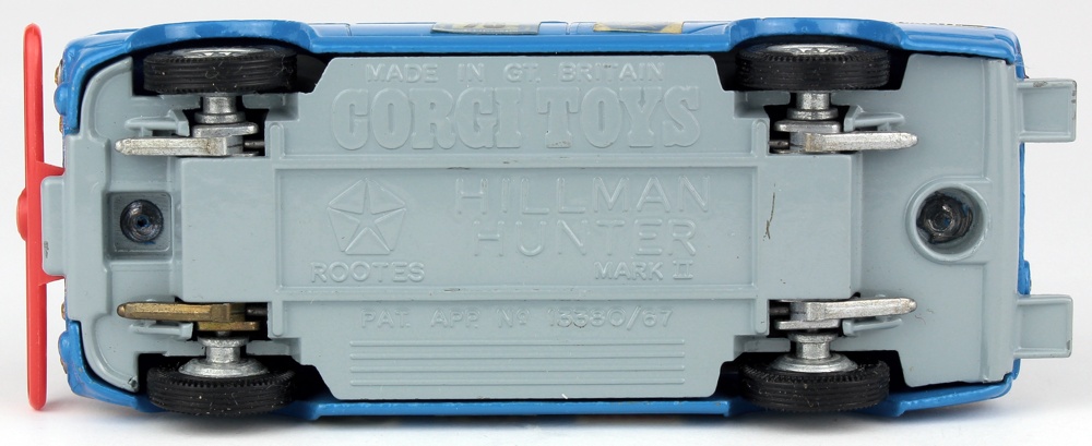 Corgi 302 Hillman Hunter Rally Car With Kangaroo. Version with SILVER Golden Jacks. Near mint plus/boxed. With leaflets and (part-applied) transfer sheet. 2nd issue box version WITHOUT 302 printed on box face etc. From The QDT Vault.
