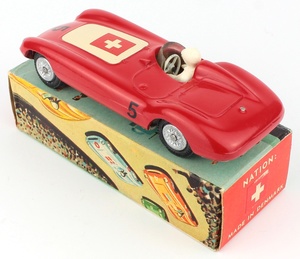A superb example of the Swiss version finished in vivid red with intact Swiss flag on the bonnet and racing number ‘5’. Driver. Intact windscreen. Fine detailed cast wheels and well-shaped original tyres. Virtually mint!