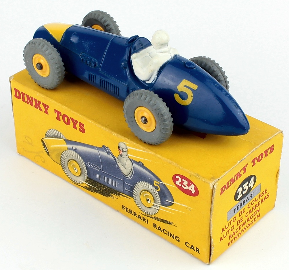 Dinky 234 Ferrari Racing Car. Very near mint/boxed. Scarce 'shark nose' version with yellow plastic wheels. Scarce model from The Brighton Collection.