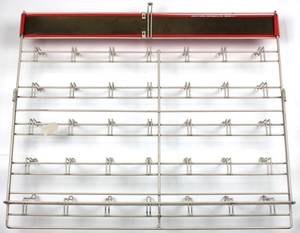 The first QDT have ever seen. This is such a rare find. With a New Jersey metal tag on the reverse, this Shop Display Stand was for the U.S. market. Composed of metal and formed t o display 36 Husky models. Tinplate header section is orange-red and white has minor marking. Stand measures 64cms x 75cms approx.