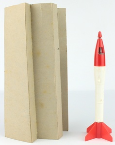 Colourful red and yellow elevating section complete with red and white missile. Complete ’U.S. ARMY HONEST JOHN DANGER’ TRANSFERS ON BOTH SIDES. Crane section raised well when the winding handle is turned.