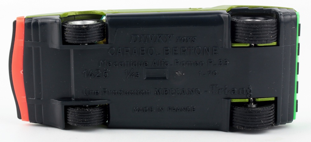 An impressive example of this Carabo Bertone model issued between 1969-71. Metallic green issue with black, green and fluorescent orange plastic parts, blue-tinted windows and a detailed interior. Shiny wheels and well-shaped original tyres. 1:43 scale.