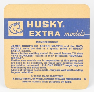 Corgi Husky 1004 Monkeemobile. Mint (sealed blister packaging). with printed UK Price. From The Monty Calme Husky & Corgi Junior Collection.QDT starting bid £250. Please note that QDT apply 12.5% buyer's commission.
