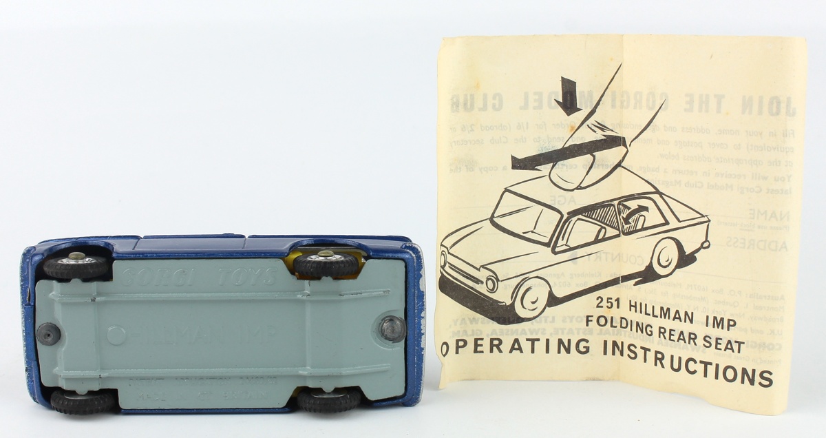 Corgi 251 Hillman Imp. Very, very near mint/boxed. Metallic DEEP BLUE version with luggage & model specific Leaflet. From The Brighton Collection.