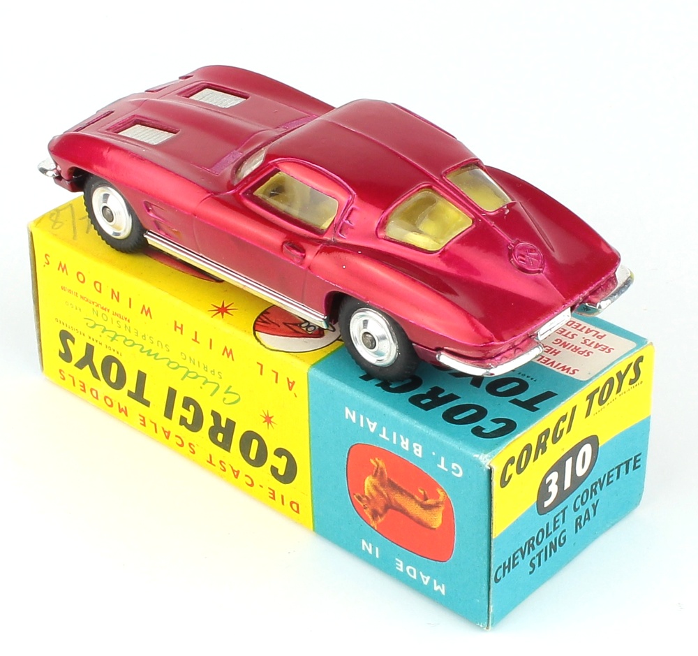 Corgi 310 Chevrolet Corvette Sting Ray. Near mint plus/boxed. Metallic cerise issue with spun wheels. Fresh box! From The QDT Vault.