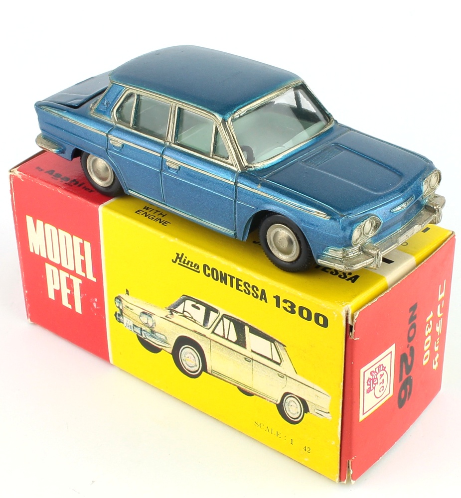Model Pet No. 26 Hino Contessa 1300. Metallic blue issue. Very near mint/boxed, with card packing insert. Scarce model from The Bickley Collection.