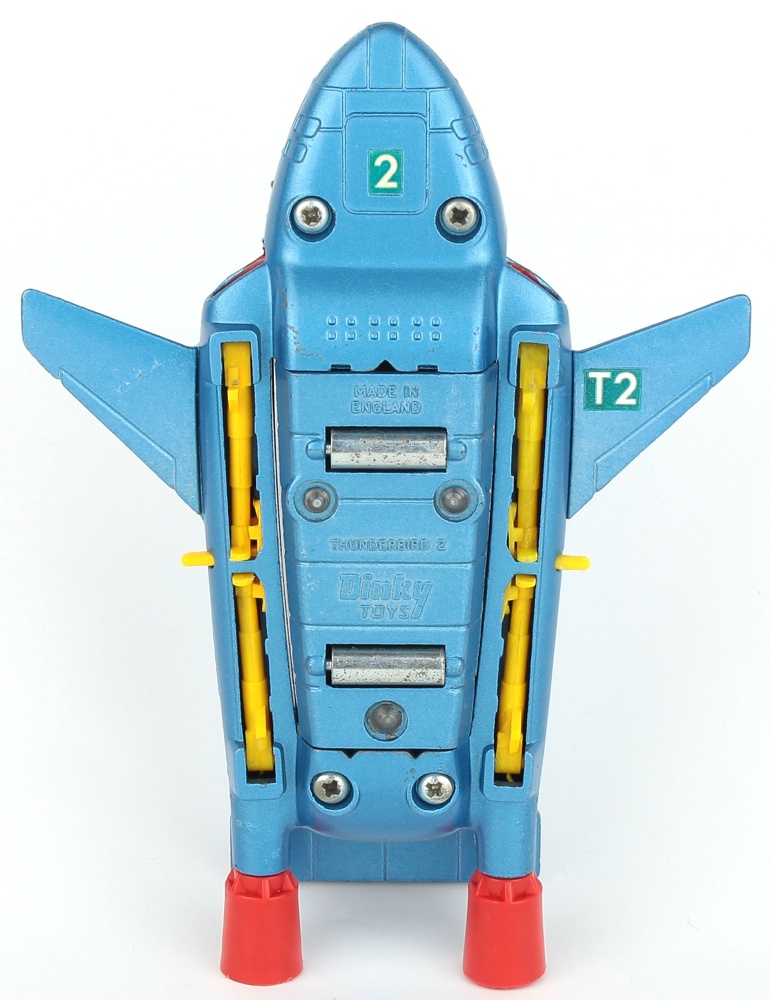 This exciting Gerry Anderson-inspired model has an original metallic blue finish, with extending yellow legs and red thrusters. Complete original labels throughout.